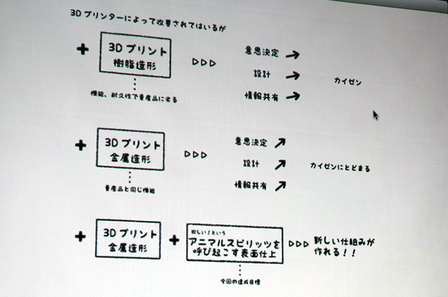 『3Dプリンタで試作して売ってみて意見を集め、売れそうだったら金型を作って量産』という全く新しい仕組みが実現できるのでは、と説明する