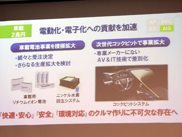 車載向け機器では、AVやIT技術といった専業メーカーにない技術で差別化を図るなど、家電以外の事業でもそれぞれの戦略で事業拡大を目指す