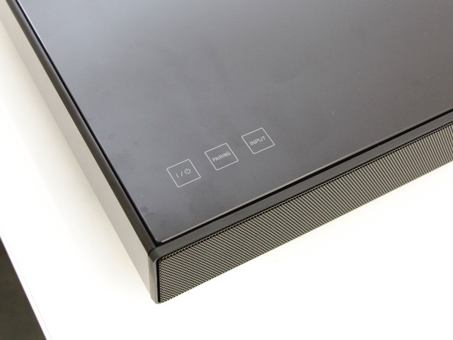 天板の左手前にタッチセンサー式に電源ボタンと入力切り替えボタン、そしてNFCペアリングのタグが用意されている