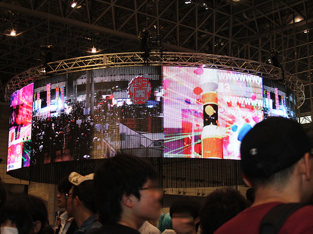 会場内では、複数の生放送中番組を映す巨大な円形モニュメントが回転していた