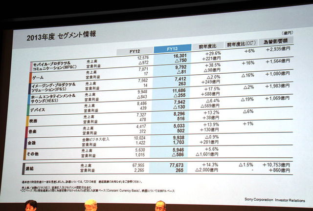 HOME > ニュース > AV&ホームシアターニュース '14年度は通期500億円の赤字見込み ソニー、テレビ事業損失縮小も'13年度は1,284億円の赤字 ファイル・ウェブ編集部 2014年05月14日 前の写真へ セグメント別の'13年度業績 前の写真へ この写真の記事へ 関連リンク 本件の詳細(PDF) ソニー