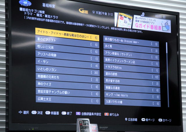 HOME > ニュース > AV&ホームシアターニュース 一挙7機種を発表 シャープ、番組とメニューを2画面表示できるAQUOSブルーレイ − 番組検索機能も向上 ファイル・ウェブ編集部 2014年05月15日 前の写真へ 次の写真へ くわしい番組カテゴリで録画番組をしぼり込み表示することが可能だ 前の写真へ 次の写真へ この写真の記事へ 関連リンク シャープ AQUOSブルーレイ 本製品のニュースリリース