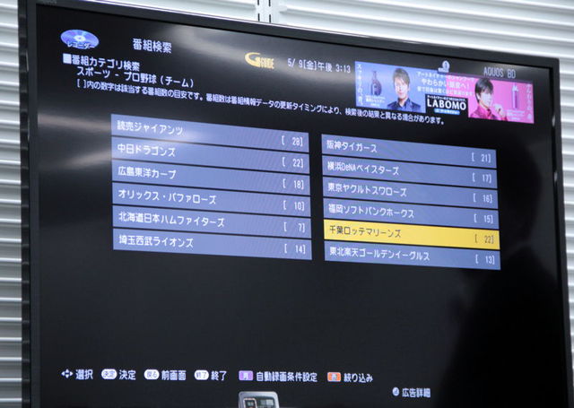 HOME > ニュース > AV&ホームシアターニュース 一挙7機種を発表 シャープ、番組とメニューを2画面表示できるAQUOSブルーレイ − 番組検索機能も向上 ファイル・ウェブ編集部 2014年05月15日 前の写真へ 次の写真へ 好きな野球チームの試合だけをリスト表示する、といったこともかんたんに行える 前の写真へ 次の写真へ この写真の記事へ 関連リンク シャープ AQUOSブルーレイ 本製品のニュースリリース