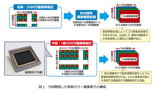 HOME > ニュース > AV&ホームシアターニュース 5月29日より開催の「技研公開2014」で公開 NHK、1億3,300万画素のCMOSセンサーを開発 ファイル・ウェブ編集部 2014年05月16日 今回開発された単板カラー撮像素子の構成 この写真の記事へ 関連リンク 本件のニュースリリース(PDF)