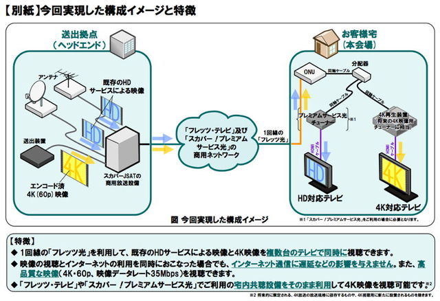 HOME > ニュース > AV&ホームシアターニュース 「フレッツ光」1回線で4K/HD同時配信 「フレッツ・テレビ」「スカパー!プレミアムサービス光」で4K放送サービス提供へ ファイル・ウェブ編集部 2014年05月21日 今回実現した構成イメージと特徴 この写真の記事へ 関連リンク スカパーJSAT発表のニュースリリース(PDF)