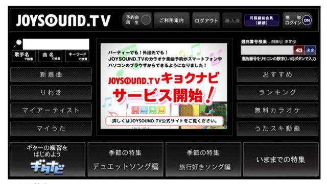 HOME > ニュース > AV&ホームシアターニュース 主要7メーカーが対応 テレビ向けカラオケ「JOYSOUND.TV」がVIERA/REGZA/REALで利用可能に ファイル・ウェブ編集部 2014年06月03日 「JOYSOUND.TV」の画面イメージ この写真の記事へ 関連リンク JOYSOUND.TV