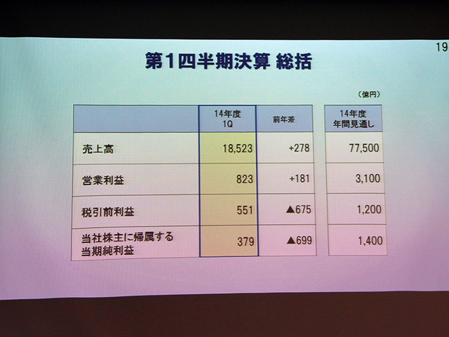 HOME > ニュース > AV&ホームシアターニュース 全体で売上高/営業利益とも増 パナソニック、'14年1Qはテレビ事業で営業利益黒字転換 ファイル・ウェブ編集部 2014年07月31日 前の写真へ 通期業績見通は前回公表値を据え置いている 前の写真へ この写真の記事へ 関連リンク 本件の詳細(PDF) パナソニック