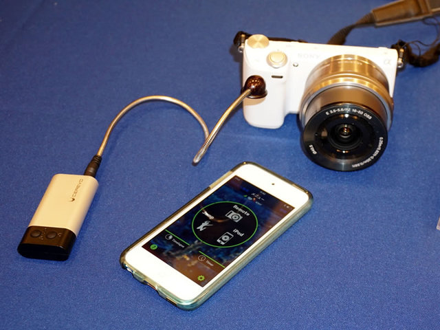 Cerevoによるワイヤレスレリーズ「SmartTrigger」。カメラ側に製品を有線で接続してスマホアプリで操作する。赤外線搭載カメラであればワイヤレスでも使用可能。またアプリからはタイムラプス撮影や、撮影者がジャンプするとシャッターを切るなどといった操作にも対応している