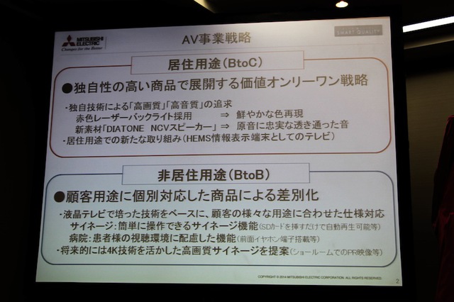 HOME > ニュース > AV&ホームシアターニュース レーザーバックライトやDIATONEスピーカーを採用 「オンリーワン技術」で満を持して4Kテレビに参入 − 三菱“REAL”「LS1」発表会レポート ファイル・ウェブ編集部 2014年08月25日 前の写真へ 次の写真へ 同社はB to C、B to Bの両面でテレビを展開していくという 前の写真へ 次の写真へ この写真の記事へ 関連リンク 三菱電機 REAL 製品情報ページ 三菱電機 三菱、4Kテレビ“REAL”LS1シリーズ ー 赤色レーザーバックライトで色域拡大