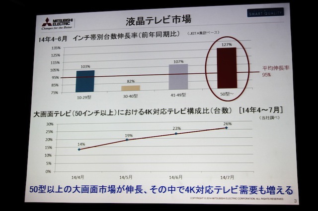 HOME > ニュース > AV&ホームシアターニュース レーザーバックライトやDIATONEスピーカーを採用 「オンリーワン技術」で満を持して4Kテレビに参入 − 三菱“REAL”「LS1」発表会レポート ファイル・ウェブ編集部 2014年08月25日 前の写真へ 次の写真へ 50型以上のテレビで、特に4Kモデルの割合は増加している 前の写真へ 次の写真へ この写真の記事へ 関連リンク 三菱電機 REAL 製品情報ページ 三菱電機 三菱、4Kテレビ“REAL”LS1シリーズ ー 赤色レーザーバックライトで色域拡大