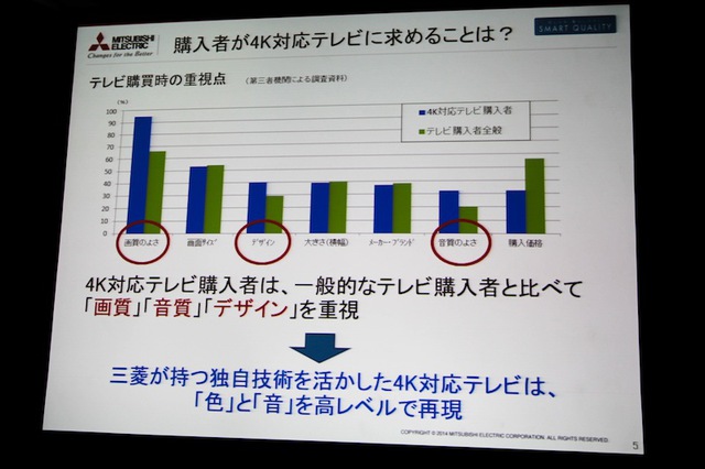 HOME > ニュース > AV&ホームシアターニュース レーザーバックライトやDIATONEスピーカーを採用 「オンリーワン技術」で満を持して4Kテレビに参入 − 三菱“REAL”「LS1」発表会レポート ファイル・ウェブ編集部 2014年08月25日 前の写真へ 4Kテレビの購入者は、画質、音質、デザインに強いこだわりをもっているとの調査結果がでたという 前の写真へ この写真の記事へ 関連リンク 三菱電機 REAL 製品情報ページ 三菱電機 三菱、4Kテレビ“REAL”LS1シリーズ ー 赤色レーザーバックライトで色域拡大