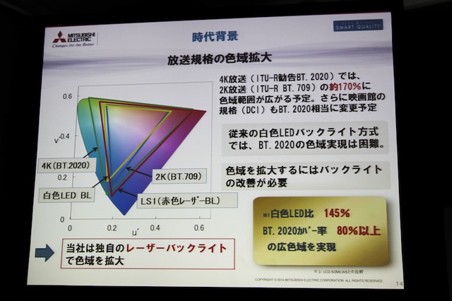 HOME > ニュース > AV&ホームシアターニュース レーザーバックライトやDIATONEスピーカーを採用 「オンリーワン技術」で満を持して4Kテレビに参入 − 三菱“REAL”「LS1」発表会レポート ファイル・ウェブ編集部 2014年08月25日 前の写真へ 次の写真へ 画質面での最大のトピックは、4K放送規格に対応するための広色域化の実現だという 前の写真へ 次の写真へ この写真の記事へ 関連リンク 三菱電機 REAL 製品情報ページ 三菱電機 三菱、4Kテレビ“REAL”LS1シリーズ ー 赤色レーザーバックライトで色域拡大