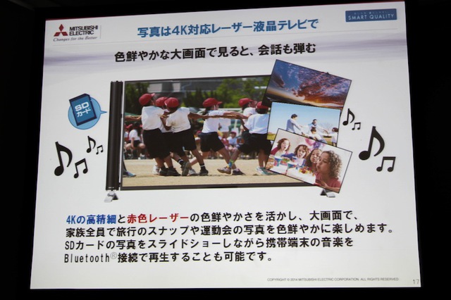 HOME > ニュース > AV&ホームシアターニュース レーザーバックライトやDIATONEスピーカーを採用 「オンリーワン技術」で満を持して4Kテレビに参入 − 三菱“REAL”「LS1」発表会レポート ファイル・ウェブ編集部 2014年08月25日 前の写真へ 次の写真へ 4Kテレビによる写真鑑賞も提案していくという 前の写真へ 次の写真へ この写真の記事へ 関連リンク 三菱電機 REAL 製品情報ページ 三菱電機 三菱、4Kテレビ“REAL”LS1シリーズ ー 赤色レーザーバックライトで色域拡大