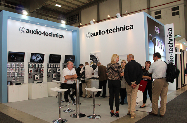 オーディオテクニカブース。壁面を使って大きくCKRシリーズをアピール