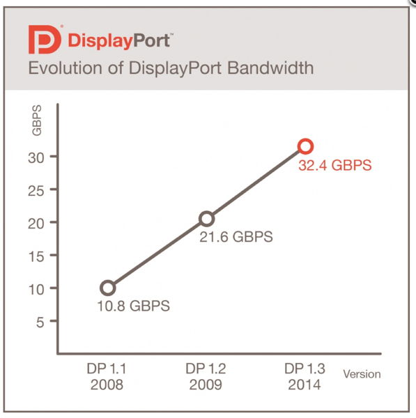 HOME > ニュース > AV&ホームシアターニュース 将来的に8K映像もサポート VESA、DisplayPort 1.3規格を発表 ー 50%高速化、5KやHDCP 2.2/HDMI 2.0対応 ファイル・ウェブ編集部 2014年09月16日 次の写真へ 最大帯域幅は32.4Gbps 次の写真へ この写真の記事へ 関連リンク VESA発表のニュースリリース(英文) DisplayPort