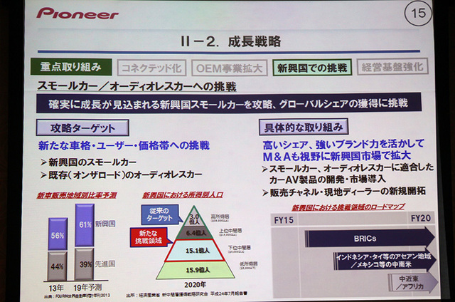 HOME > ニュース > AV&ホームシアターニュース 事業方針説明会を開催 “パイオニアが変わる最後のチャンス” − カーエレにリソース集中する新事業方針を発表 ファイル・ウェブ編集部 2014年09月16日 前の写真へ 次の写真へ 確実に成長が見込まれるという新興国スモールカー市場に注力しシェア獲得を図るほか、グループ全体のスリム化も行い経営体制も整える 前の写真へ 次の写真へ この写真の記事へ 関連リンク 事業方針についてのニュースリリース DJ機器事業譲渡についてのニュースリリース(1) DJ機器事業譲渡についてのニュースリリース(2)
