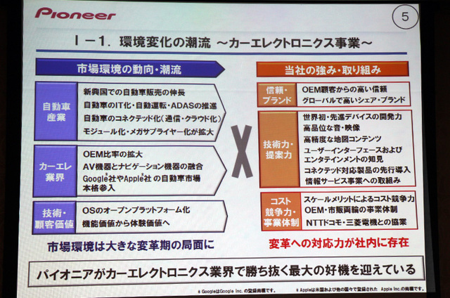HOME > ニュース > AV&ホームシアターニュース 事業方針説明会を開催 “パイオニアが変わる最後のチャンス” − カーエレにリソース集中する新事業方針を発表 ファイル・ウェブ編集部 2014年09月16日 前の写真へ 次の写真へ 変革の曲面を迎える市場環境のなかで、パイオニアが勝ち抜いていける力を持っていることをアピール。『総合インフォテインメント』のリーディングカンパニーを目指すとした。 前の写真へ 次の写真へ この写真の記事へ 関連リンク 事業方針についてのニュースリリース DJ機器事業譲渡についてのニュースリリース(1) DJ機器事業譲渡についてのニュースリリース(2)