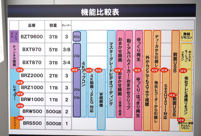 HOME > ニュース > AV&ホームシアターニュース リモコンも変更して操作性改善 パナソニック、4Kアップコン拡充やSeeQVault対応の“DIGA”4機種 ファイル・ウェブ編集部 2014年09月22日 前の写真へ 今後のDIGAラインナップの機能比較表 前の写真へ この写真の記事へ 関連リンク パナソニック DIGA 情報ページ パナソニック
