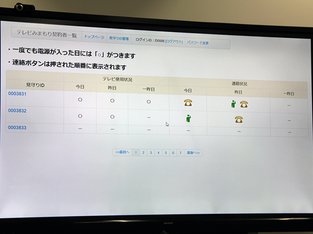 HOME > ニュース > AV&ホームシアターニュース より良い地域社会の実現をめざす シャープ、「テレビ見守りサービス」を地域電気販売店向けに11月提供開始 ファイル・ウェブ編集部 2014年09月24日 前の写真へ 地域電気販売店は、PCからブラウザ経由でユーザーのテレビ使用状況を遠隔モニタリングできる。インターネット設備とPCがあれば基本サービスは展開できるので、ハードの初期投資は必要ない 前の写真へ この写真の記事へ 関連リンク 本件のニュースリリース シャープ