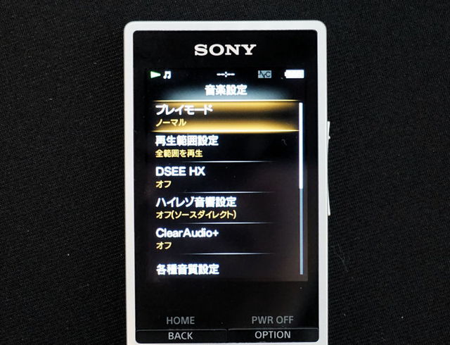 音楽設定画面。DSEE HXなど各種機能のオン/オフが可能だ