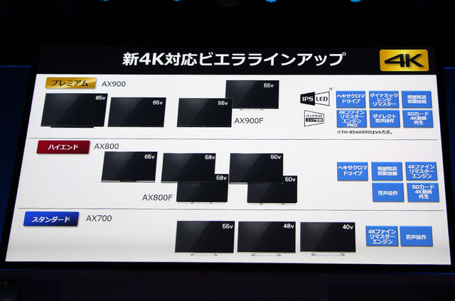 HOME > ニュース > AV&ホームシアターニュース 音声操作やリモート視聴にも対応 パナソニック、気軽に高画質を楽しめる4Kテレビ入門機「AX700」シリーズ ファイル・ウェブ編集部 2014年09月25日 前の写真へ 次の写真へ 4K VIERAのラインナップは一挙に3シリーズ11モデルに。 前の写真へ 次の写真へ この写真の記事へ 関連リンク パナソニック「VIERA」公式サイト パナソニック AX700シリーズのニュースリリース