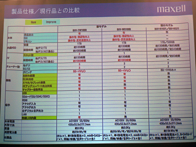 HOME > ニュース > AV&ホームシアターニュース 「お好み録画」やスマホへのワイヤレス持ち出しなども マクセル、ダブルiVDRスロット機などHDD/iVDR/BD対応レコーダー“アイヴィブルー”新モデル ファイル・ウェブ編集部 2014年10月06日 前の写真へ 前の写真へ この写真の記事へ 関連リンク 製品の詳細(PDF) 日立マクセル
