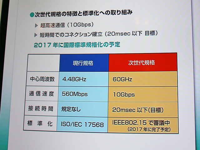 HOME > ニュース > AV&ホームシアターニュース SeeQVault+TransferJet提案も <CEATEC>次世代TransferJet、60GHz帯/10Gbpsの“超”高速近距離通信へ ファイル・ウェブ編集部 2014年10月08日 前の写真へ 次の写真へ 次世代TransferJetの特徴 前の写真へ 次の写真へ この写真の記事へ 関連リンク CEATEC JAPAN 2014関連記事一覧 CEATEC JAPAN 2014公式サイト