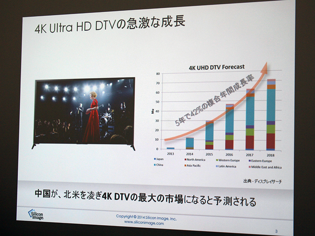 HOME > ニュース > AV&ホームシアターニュース Silicon Image、CEATECでプライベートショウ開催 「MHL」急成長、対応製品が6億5千万台突破 − 4Kテレビ伸長は中国市場が牽引 ファイル・ウェブ編集部 2014年10月10日 次の写真へ 4Kテレビ市場の急成長について。今後とも中国が北米を凌いで最大市場になると予測 次の写真へ この写真の記事へ 関連リンク CEATEC JAPAN 2014関連記事一覧 CEATEC JAPAN 2014公式サイト