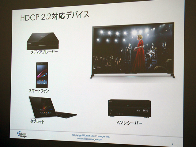 HOME > ニュース > AV&ホームシアターニュース Silicon Image、CEATECでプライベートショウ開催 「MHL」急成長、対応製品が6億5千万台突破 − 4Kテレビ伸長は中国市場が牽引 ファイル・ウェブ編集部 2014年10月10日 前の写真へ 次の写真へ HDCP2.2対応デバイスも登場しはじめてきた 前の写真へ 次の写真へ この写真の記事へ 関連リンク CEATEC JAPAN 2014関連記事一覧 CEATEC JAPAN 2014公式サイト