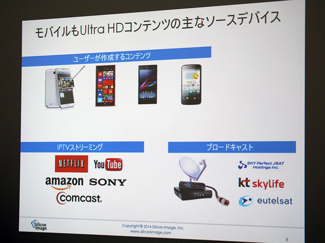 HOME > ニュース > AV&ホームシアターニュース Silicon Image、CEATECでプライベートショウ開催 「MHL」急成長、対応製品が6億5千万台突破 − 4Kテレビ伸長は中国市場が牽引 ファイル・ウェブ編集部 2014年10月10日 前の写真へ 次の写真へ 現行の4Kソースデバイスとして、スマホ/タブレットなどモバイル製品の存在も大きい 前の写真へ 次の写真へ この写真の記事へ 関連リンク CEATEC JAPAN 2014関連記事一覧 CEATEC JAPAN 2014公式サイト