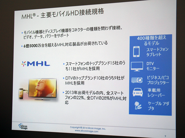 HOME > ニュース > AV&ホームシアターニュース Silicon Image、CEATECでプライベートショウ開催 「MHL」急成長、対応製品が6億5千万台突破 − 4Kテレビ伸長は中国市場が牽引 ファイル・ウェブ編集部 2014年10月10日 前の写真へ 次の写真へ MHL対応機器は全世界で400種類のモデルに拡充し、出荷台数は6億5千万台を超えた 前の写真へ 次の写真へ この写真の記事へ 関連リンク CEATEC JAPAN 2014関連記事一覧 CEATEC JAPAN 2014公式サイト
