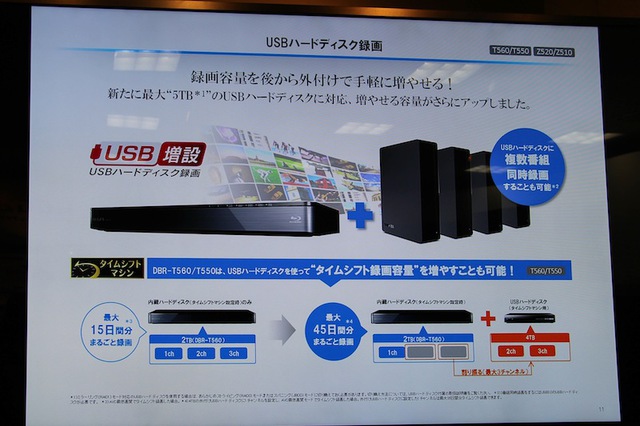 新たに最大5GBのUSBハードディスクに対応し、同時接続は4台まで可能。タイムシフトマシン録画先をUSBハードディスクに指定することもできる