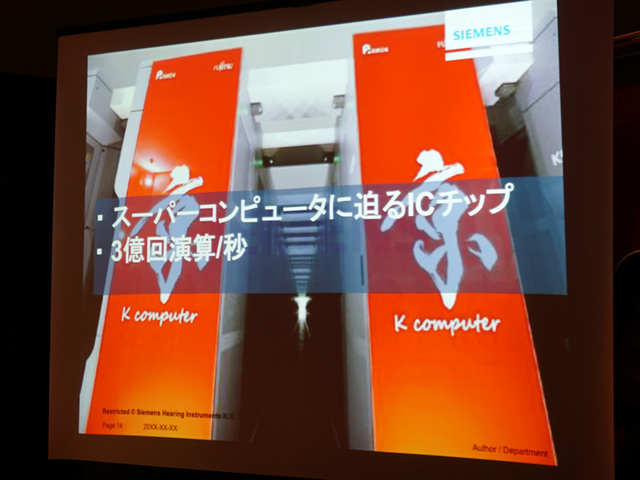 「スーパーコンピューターに迫るICチップを搭載した」とアピール。左右の耳から入ってきた様々な音を脳で処理するという人間の構造に近い処理をすることで、補聴器としての性能を高めている