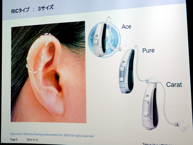 3タイプを用意。耳たぶの後ろに本体を隠し、細いコードで繋がっているイヤホン部を耳の中に入れて使用する