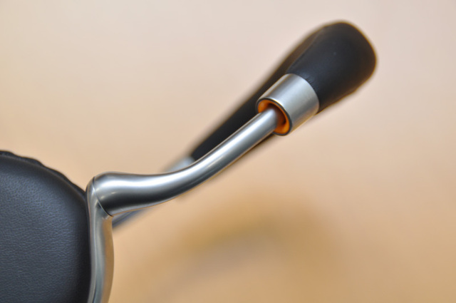 曲線を活かしたヒンジのデザイン。接続部分にはブランドのテーマカラーであるオレンジをワンポイントとして配置した