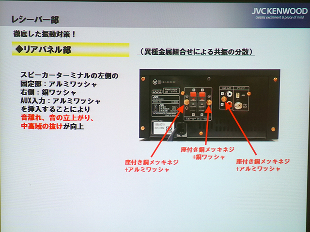 HOME > ニュース > AV&ホームシアターニュース 担当者が特徴をアピール JVC、音質にこだわった“ウッドコーン”コンポ新入門機「EX-S5」 − シリーズ初のBluetooth対応 ファイル・ウェブ編集部 2015年01月29日 前の写真へ 次の写真へ リアパネル部のパーツ固定でも振動抑制に配慮 前の写真へ 次の写真へ この写真の記事へ 関連リンク 製品の詳細 モニターキャンペーン詳細ページ(開設準備中) JVCケンウッド ファイル・ウェブ特設サイト「JVC TECH-PARK」