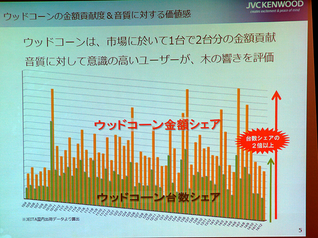 HOME > ニュース > AV&ホームシアターニュース 担当者が特徴をアピール JVC、音質にこだわった“ウッドコーン”コンポ新入門機「EX-S5」 − シリーズ初のBluetooth対応 ファイル・ウェブ編集部 2015年01月29日 前の写真へ 次の写真へ ウッドコーンは台数に対して2倍の金額シェア。音質に対するこだわりの強いユーザーが、単価が高くてもウッドコーンを選んでいると分析 前の写真へ 次の写真へ この写真の記事へ 関連リンク 製品の詳細 モニターキャンペーン詳細ページ(開設準備中) JVCケンウッド ファイル・ウェブ特設サイト「JVC TECH-PARK」