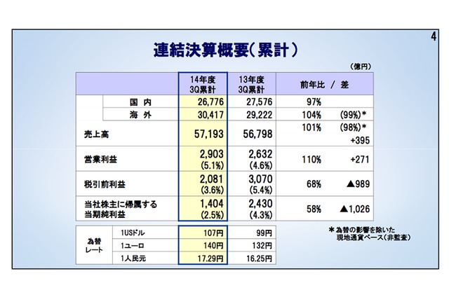 HOME > ニュース > AV&ホームシアターニュース 事業改革の効果をアピール パナソニック、'14年度3Qは営業利益10%増 − 中国でのテレビ生産終了「赤字幅着実に小さく」 ファイル・ウェブ編集部 2015年02月03日 前の写真へ 次の写真へ 2014年度1〜3Qまでの累計連結決算 前の写真へ 次の写真へ この写真の記事へ 関連リンク パナソニックのIR情報 2014年度3Q累計業績説明資料