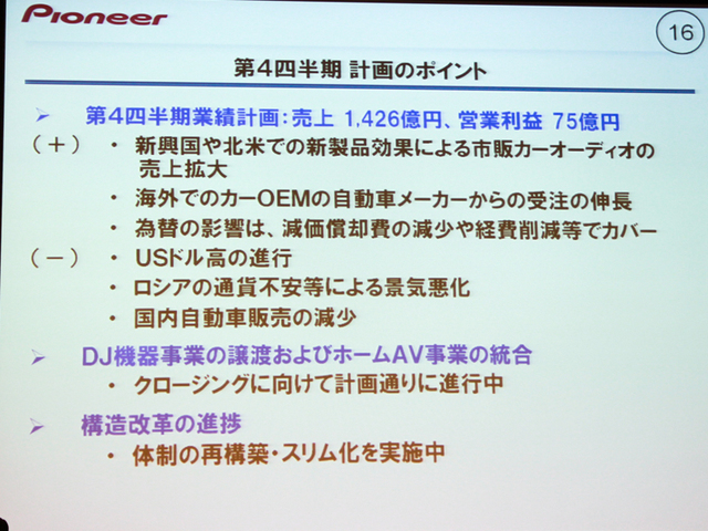 HOME > ニュース > AV&ホームシアターニュース 3ヶ月累計で47億円の損失 パイオニア、'14年3Q決算発表 − 累計営業利益は計画を上回る50億円 ファイル・ウェブ編集部 2015年02月09日 前の写真へ 第4四半期の計画の概要 前の写真へ この写真の記事へ 関連リンク 本件のニュースリリース パイオニア(株)