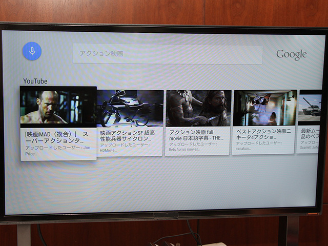 「アクション映画」と音声検索した画面。YouTube内の該当コンテンツが表示されている