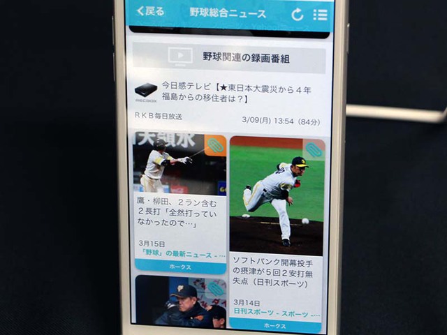 「野球」チャンネルを開いたところ。録画番組のほか、インターネット上の関連記事などが表示されている