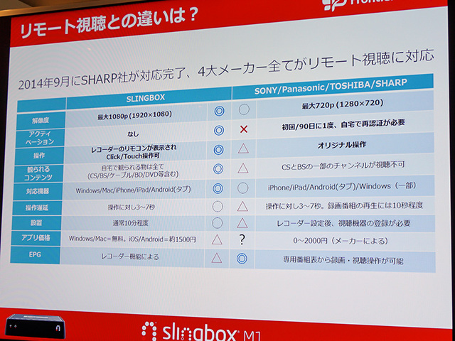 HOME > ニュース > AV&ホームシアターニュース ChromecastやWi-Fiなどに対応。PCレス設定も可能に iPhoneなどで外出先からテレビ視聴、“Slingbox”に機能強化した新モデル「M1」 編集部:小野佳希 2015年03月25日 前の写真へ リモート視聴に対して多くの優位性を持つと説明 前の写真へ この写真の記事へ 関連リンク Slingbox日本サイト