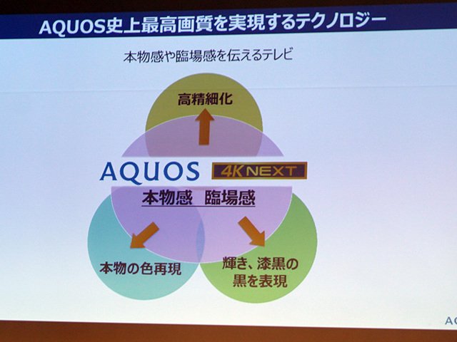 加藤氏は本機の高画質化のポイントを、高精細化、広色域か、高コントラスト化の3点に絞ったと説明