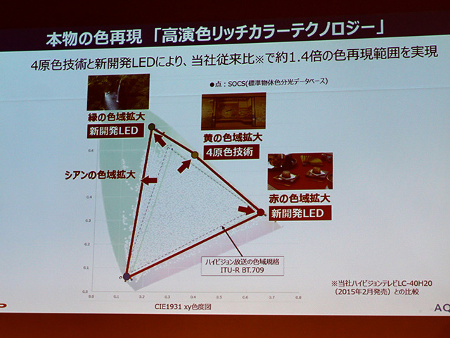HOME > ニュース > AV&ホームシアターニュース 価格は168万円前後 シャープ、8K解像度を実現した “AQUOS 4K NEXT” 「80XU30」 ファイル・ウェブ編集部 2015年05月21日 前の写真へ 図中の三角形の内側や周辺にある白い部分は「世の中に存在する本物の色」(加藤氏)とのことで、「本物の色をできるだけカバーする色拡大を追求している」とした 前の写真へ この写真の記事へ 関連リンク AQUOS 製品情報ページ シャープ