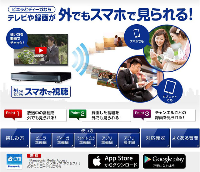 HOME > ニュース > AV&ホームシアターニュース 「外からどこでもスマホで視聴」がバージョンアップ パナソニック、リモート視聴アプリ「Panasonic Media Access」がBluetooth機器への音声出力に対応 ファイル・ウェブ編集部 2015年06月24日 この写真の記事へ 関連リンク iOS版ダウンロードページ Android版ダウンロードページ 本件の詳細 パナソニック
