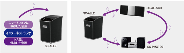 さまざまなコンテンツを「SC‐ALL2」に伝送したり、それぞれのAllPlay対応機器で再生中の音源を別のAllPlay対応機器に伝送して聴くことが可能