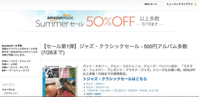 HOME > ニュース > AV&ホームシアターニュース 8月18日まで。週替わりでジャンルも変わる Amazon Music、アルバム100円から楽曲購入できるサマーセールを開催 編集部:風間雄介 2015年07月15日 50%OFF以上の作品が多数用意されている この写真の記事へ 関連リンク 「Amazon Music」サマーセール