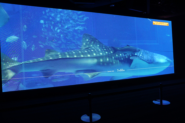 等身大のジンベイザメは全幅7m60のディスプレイにも収まらない大きさ