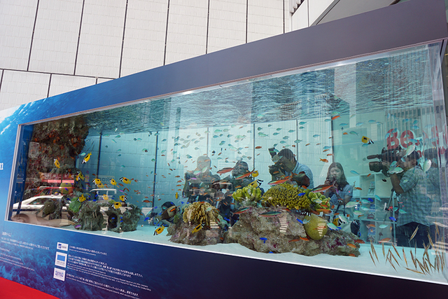 屋外の大水槽を始め用意されたいくつかの水槽には沖縄から移送されてきた魚たちが泳いでいる