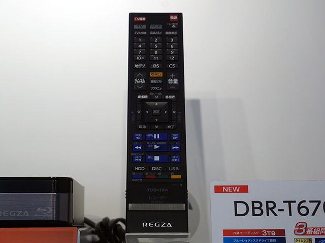 HOME > ニュース > AV&ホームシアターニュース 3チューナー/3TB HDD内蔵で実売約10万円 東芝、全録レコーダー“レグザサーバー”新モデル「DBR-T670」。GUI刷新で操作性向上 編集部:小野佳希 2015年10月15日 次の写真へ リモコン 次の写真へ この写真の記事へ 関連リンク 東芝 レグザサーバー/レグザブルーレイ 公式ページ